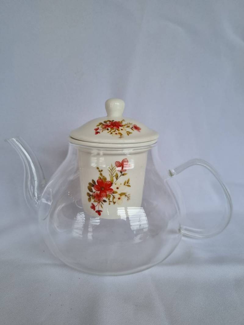 Chaleira de vidro 1,1 litros com infusor e tampa em cerâmica flores vermelhas